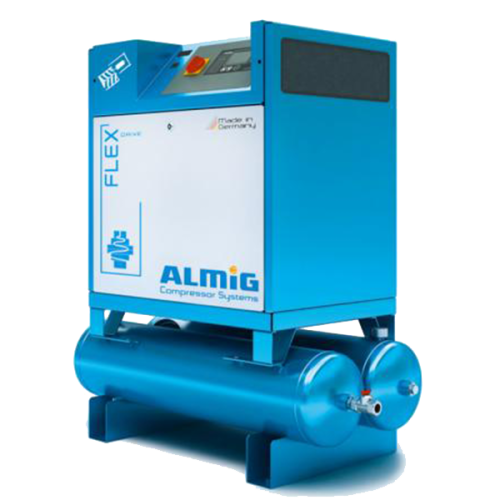 Винтовой компрессор ALMiG серии FLEX имеет частотный преобразователь, в котором применяется интегрированная технология SCD (Speed Controlled and Direct drive). Такие компрессоры способны обеспечивать максимальную эффективность при непостоянных нагрузках, что позволяет достичь до 35% экономии электроэнергии. Модели FLEX R оснащены ресивером на два баллона, а модели FLEX PLUS и FLEX O - рефрижераторным осушителем сжатого воздуха. Помимо этого, FLEX O укомплектованы системой фильтров, состоящей из одного пористого фильтра и двух фильтров с активированным углем. Такой комплект применяется для получения технического безмаслянного сжатого воздуха.